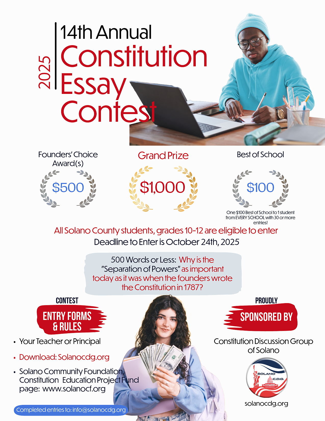 Join us in empowering Solano County’s youth to deepen their understanding of the U.S. Constitution through the 14th Annual Solano County Constitution Essay Contest, commemorating the 238th anniversary of the U.S. Constitution. Solano Constitution Discussion Group (CDG) leadership team is honored to be asked by the Constitutional Literacy Advocates, (CLA) board to take over and continue this amazing educational project. Your generous contributions will fuel the 2025 Constitution Essay Contest and sustain the vital work of the Solano Constitution Discussion Group (CDG) educational project, Constitution Literacy Youth Scholarship (CLYS), ensuring students and educators have the resources they need to thrive.